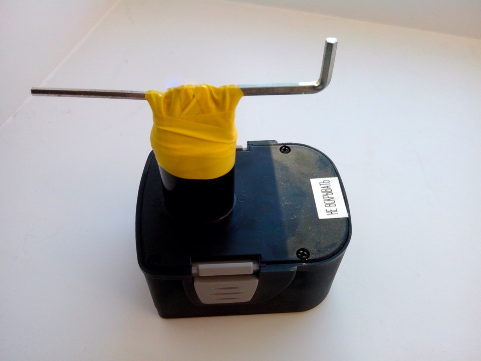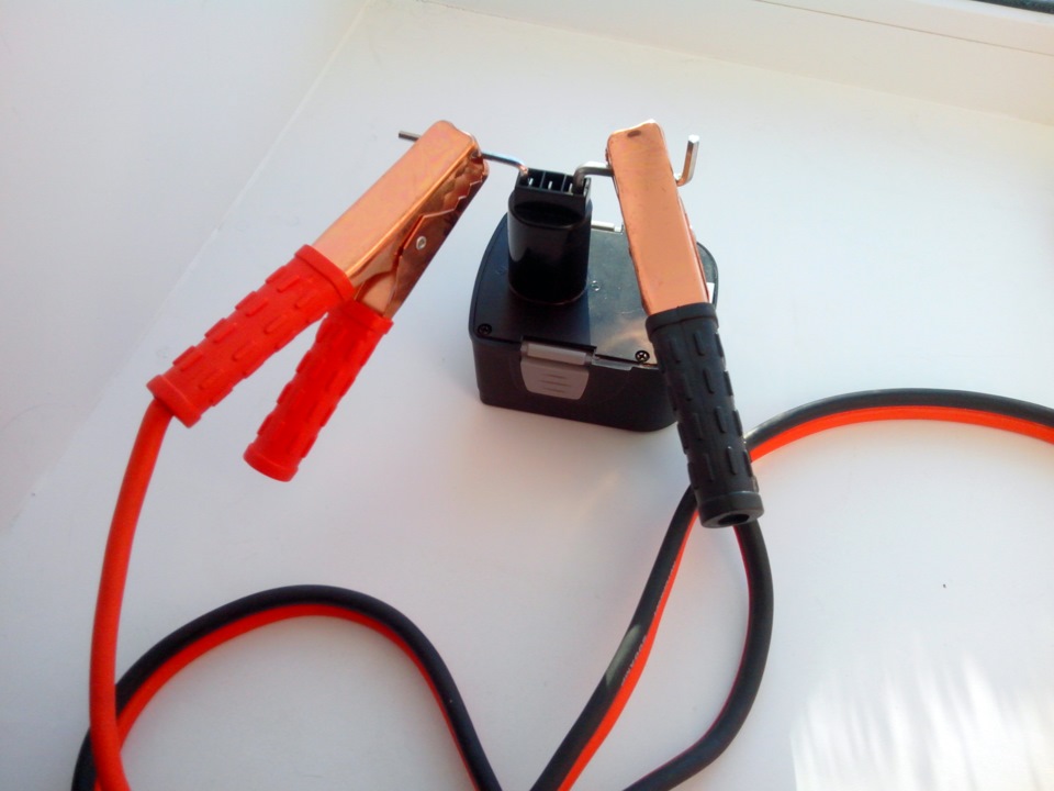 Создание клемм. Вставьте в гнезда аккумулятора инструмента по гвоздю или толстому саморезу. Они должны сидеть максимально плотно, чтобы не болтаться — от этого зависит качество контакта и нагрев проводов. Если контакты наружные, просто примотайте гвозди к ним изолентой .
